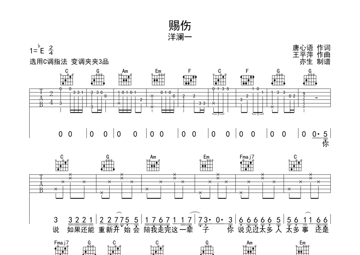 • 赐伤吉他谱 - 洋澜一 - C调吉他弹唱谱第1张