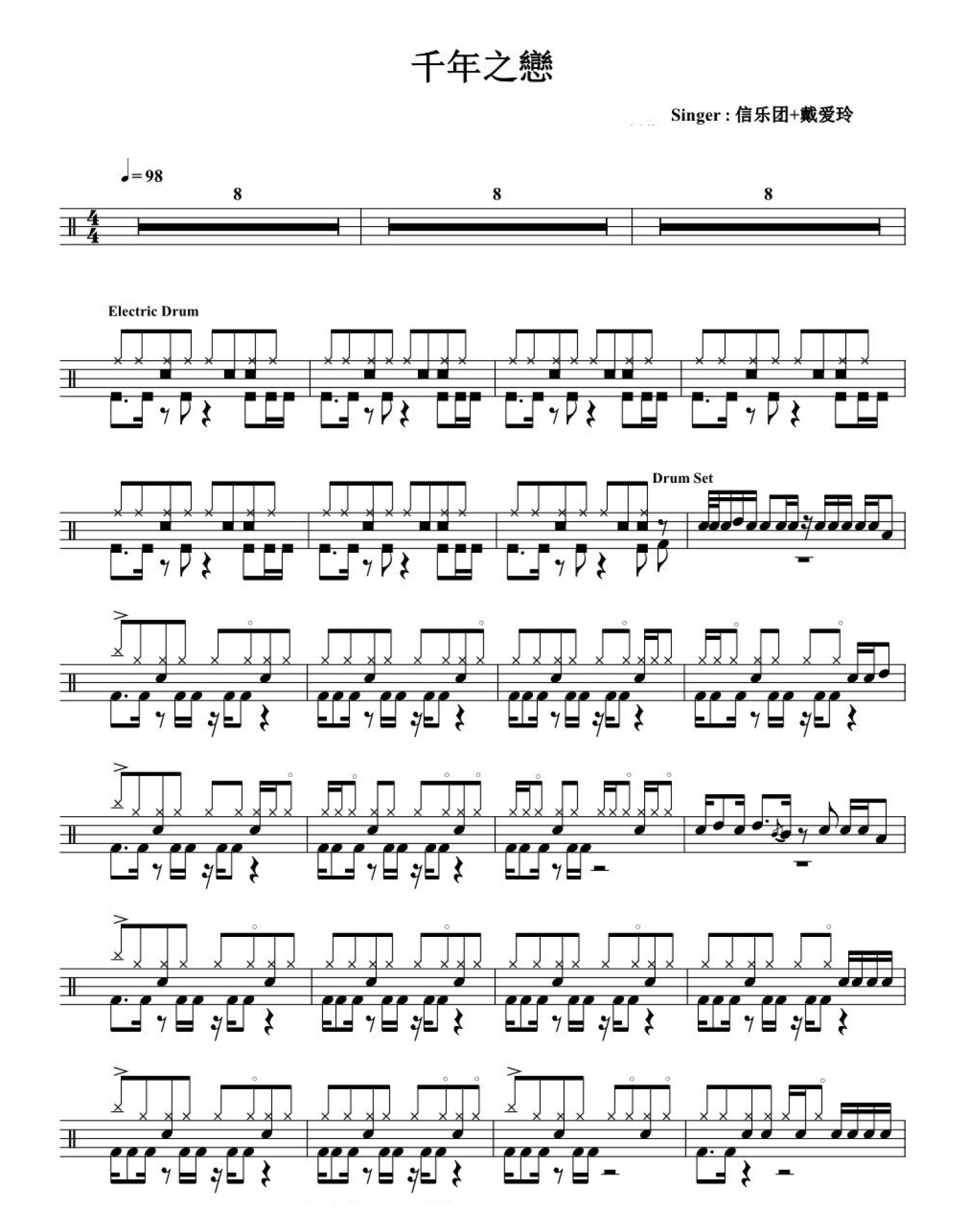 曲谱介绍: 千年之恋(架子鼓谱)-信乐团