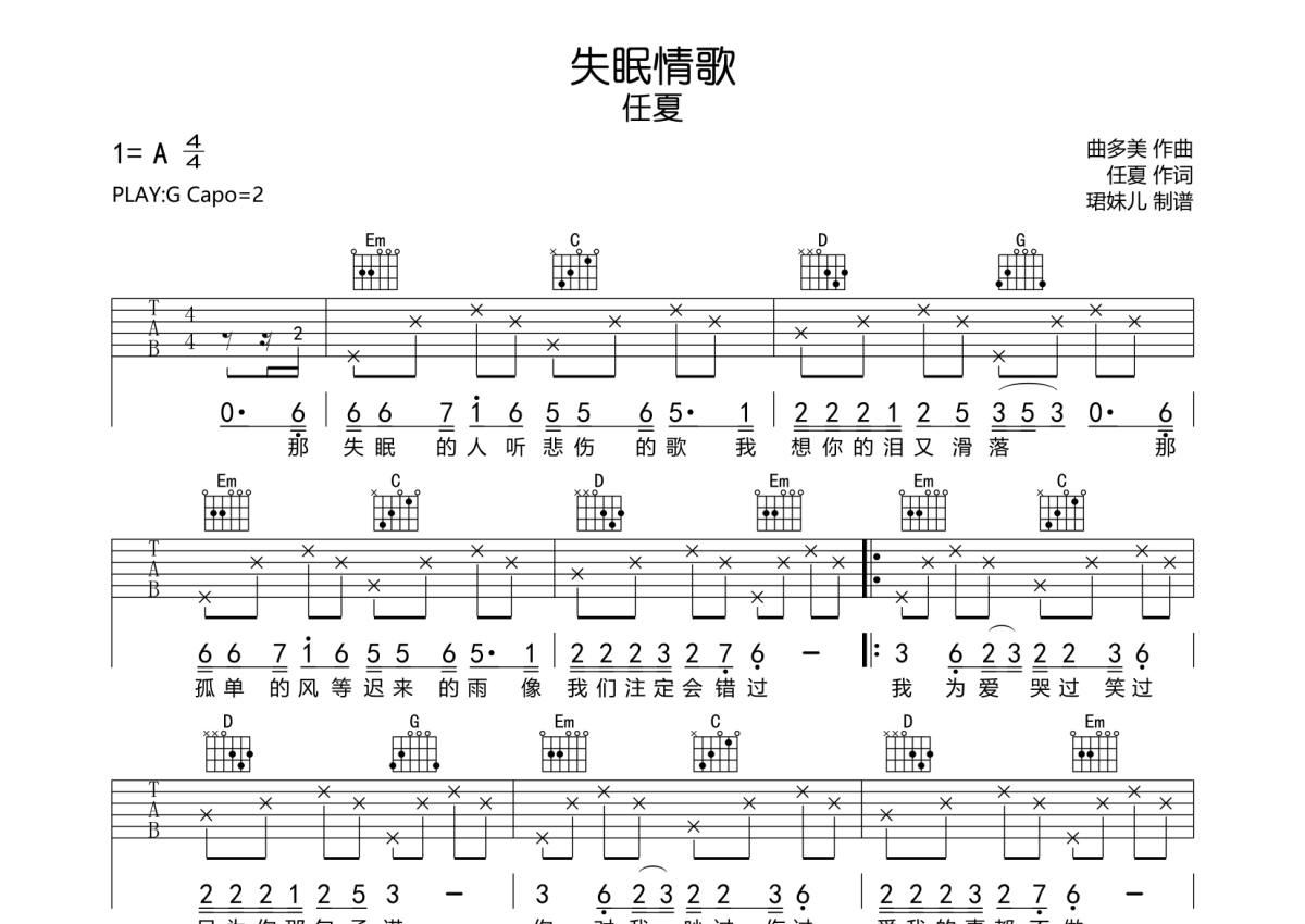 • 失眠情歌吉他谱 - 任夏 - G调吉他弹唱谱第1张