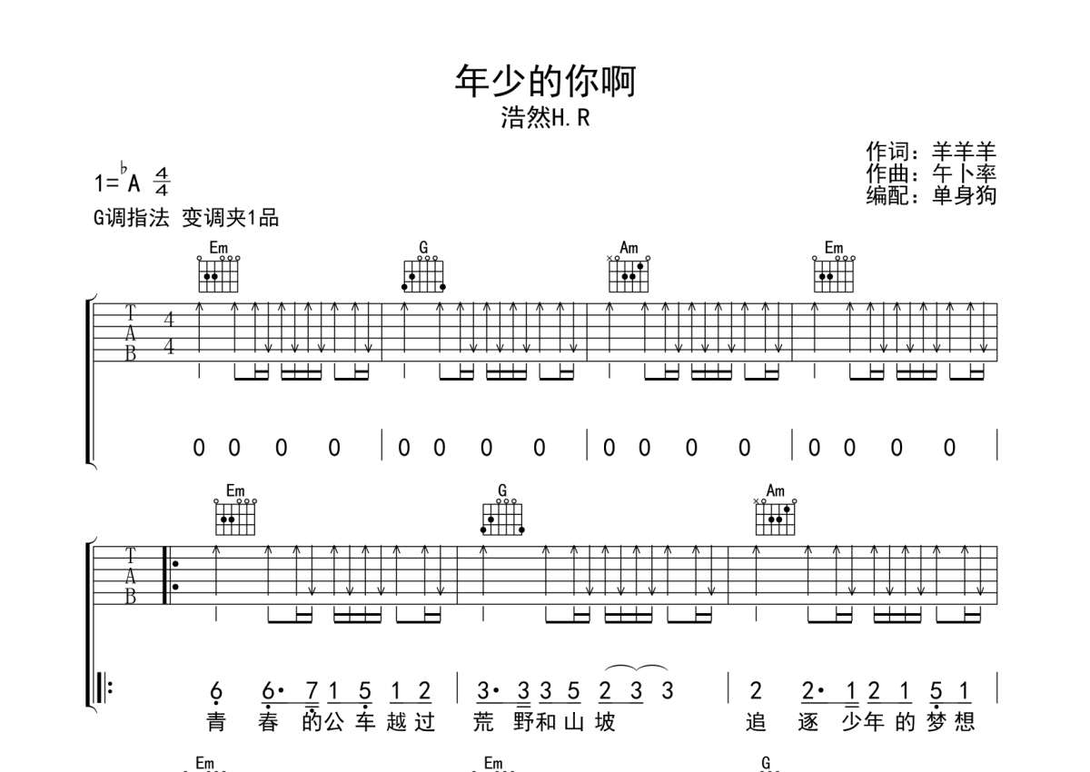 曲谱介绍: 浩然H.R《年少的你啊》吉他弹唱谱,采用G调指法编配,单身狗编配出品,共有3张高清图谱。