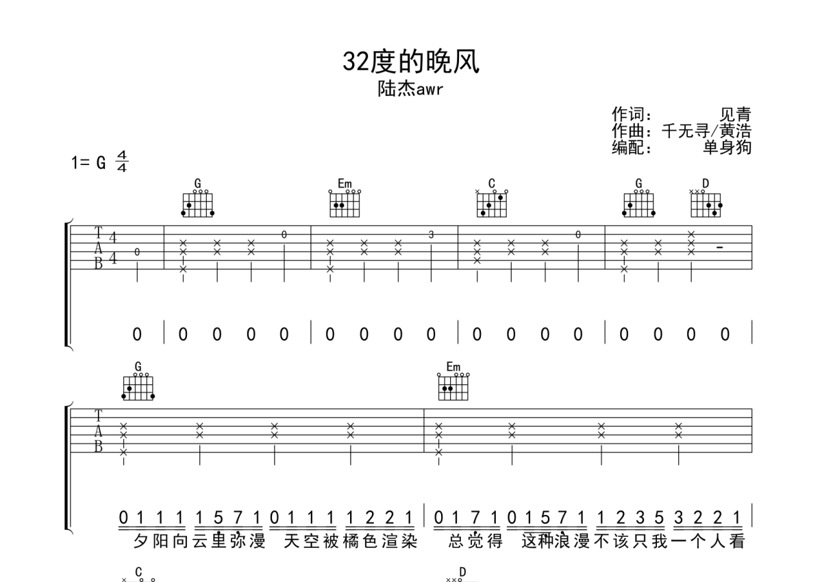 曲谱介绍: 陆杰awr《32度的晚风》吉他弹唱谱,采用G调指法编配,单身狗编配出品,共有3张高清图谱。