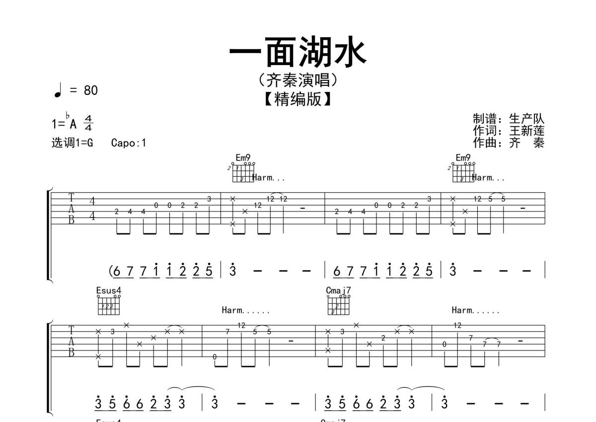 曲谱介绍: 齐秦《一面湖水》吉他弹唱谱,采用G调指法编配精编民谣版,生产队编配出品,共有3张高清图谱。
