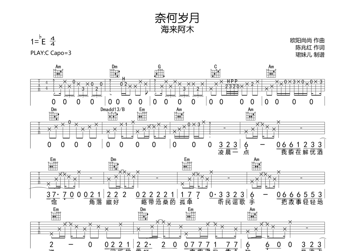 曲谱介绍: 海来阿木《奈何岁月》吉他弹唱谱,采用C调指法编配,珺妹儿编配出品,共有2张高清图谱,免翻页排版设计。