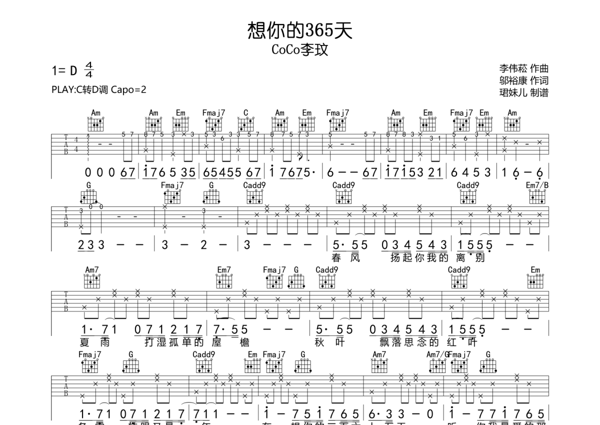 曲谱介绍: 李玟《想你的365天》吉他弹唱谱,采用C调指法编配,珺妹儿编配出品,共有2张高清图谱,免翻页排版设计。