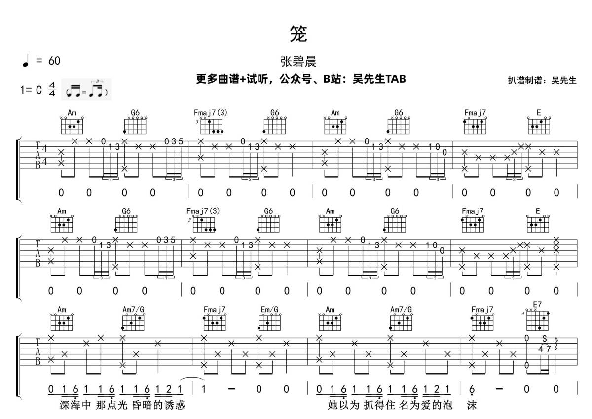 曲谱介绍: 张碧晨《笼》吉他弹唱谱,采用C调指法编配,吴先生TAB编配出品,共有3张高清图谱。
