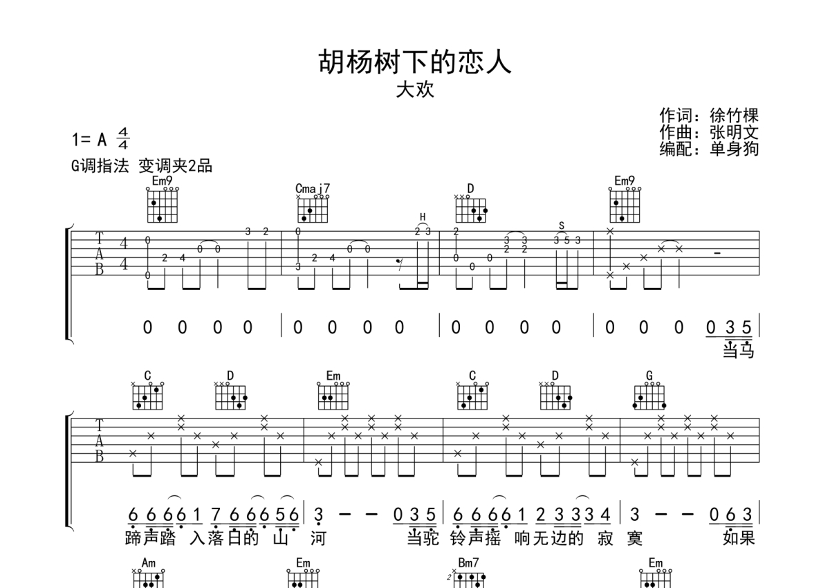 曲谱介绍: 大欢《胡杨树下的恋人》吉他弹唱谱,采用G调指法编配,单身狗编配出品,共有3张高清图谱。