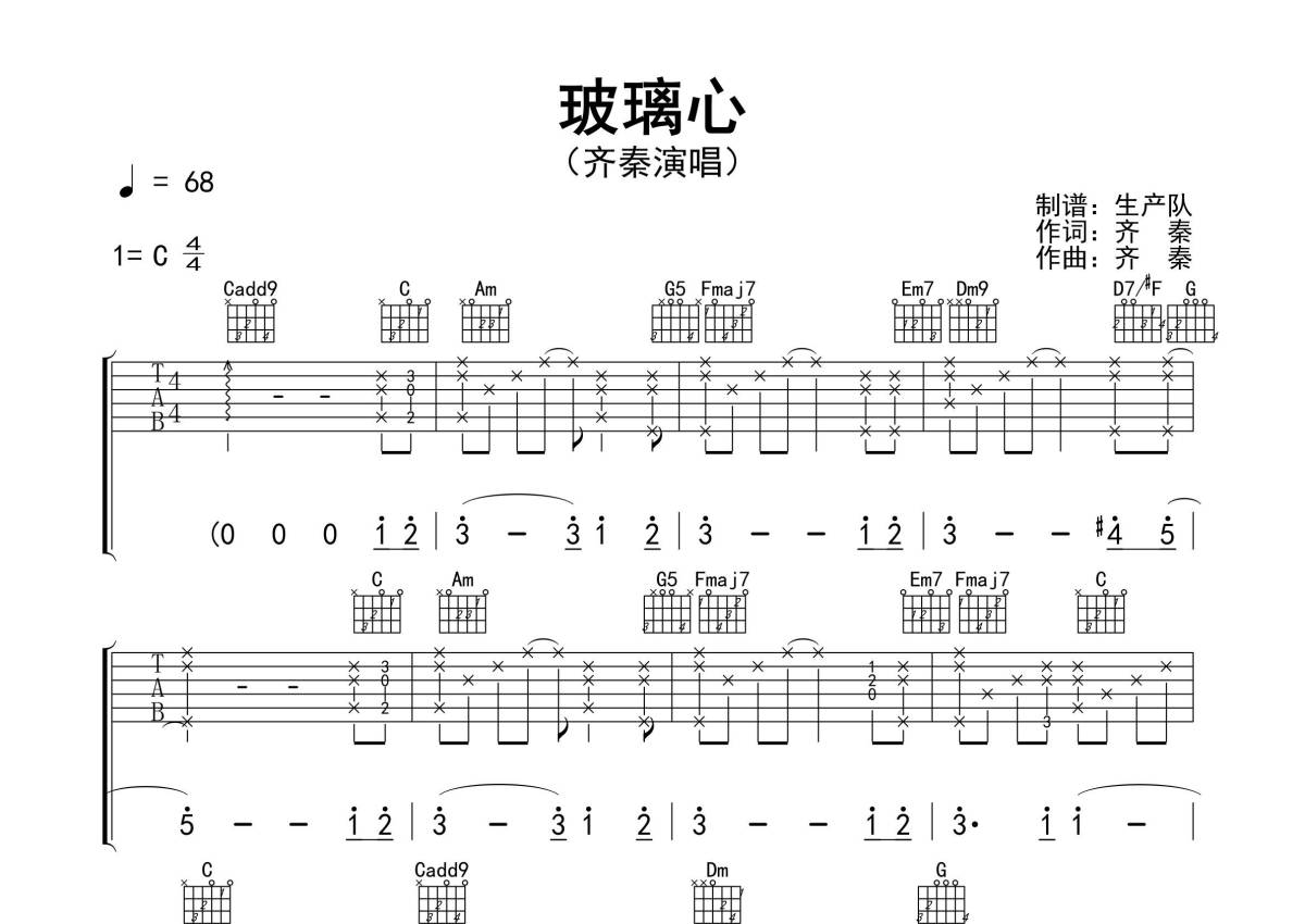 曲谱介绍: 齐秦《玻璃心》吉他弹唱谱,采用C调指法编配精编民谣版,生产队编配出品,共有3张高清图谱。