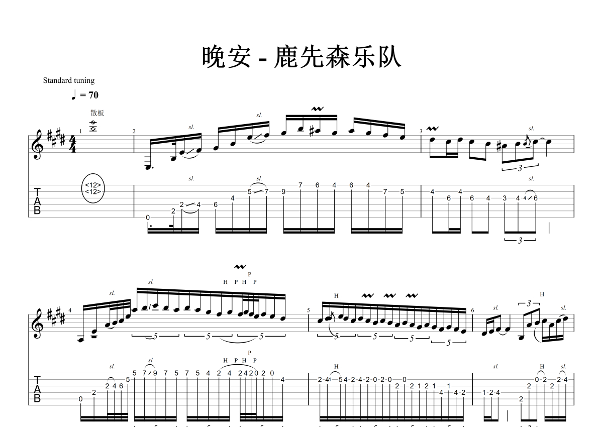 • 晚安吉他谱 - 鹿先森乐队 - E调吉他独奏谱 - 原版记谱第1张