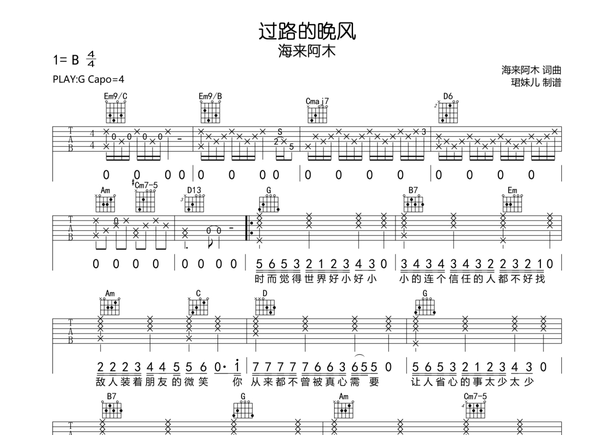 曲谱介绍: 海来阿木《过路的晚风》吉他弹唱谱,采用G调指法编配,珺妹儿编配出品,共有2张高清图谱,免翻页排版设计。
