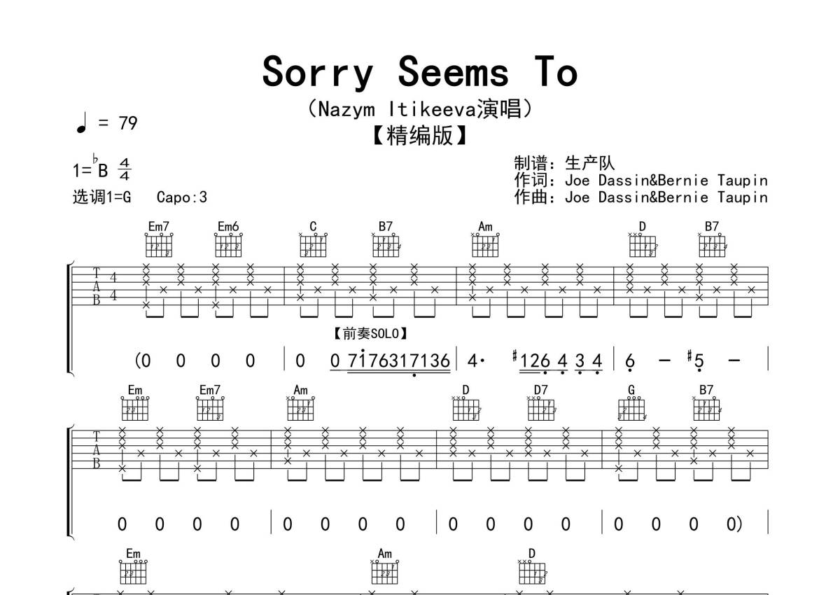 曲谱介绍: NazymItikeeva《SorrySeemsTo》吉他弹唱谱,采用G调指法编配精编版,生产队编配出品,共有3张高清图谱。