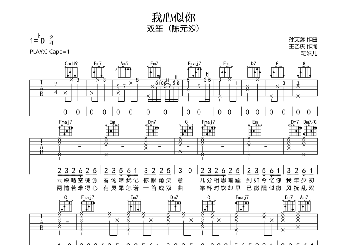 • 我心似你吉他谱 - 双笙 (陈元汐) - C调吉他弹唱谱第1张