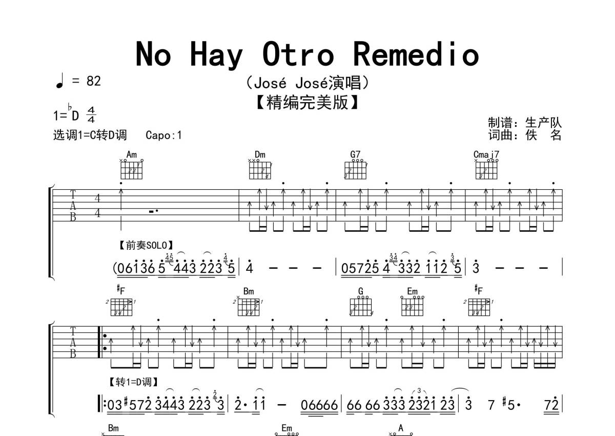 曲谱介绍: JoséJosé《NoMayOtroRemedio》吉他弹唱谱,采用C调指法编配精编完美版,生产队编配出品,共有3张高清图谱。