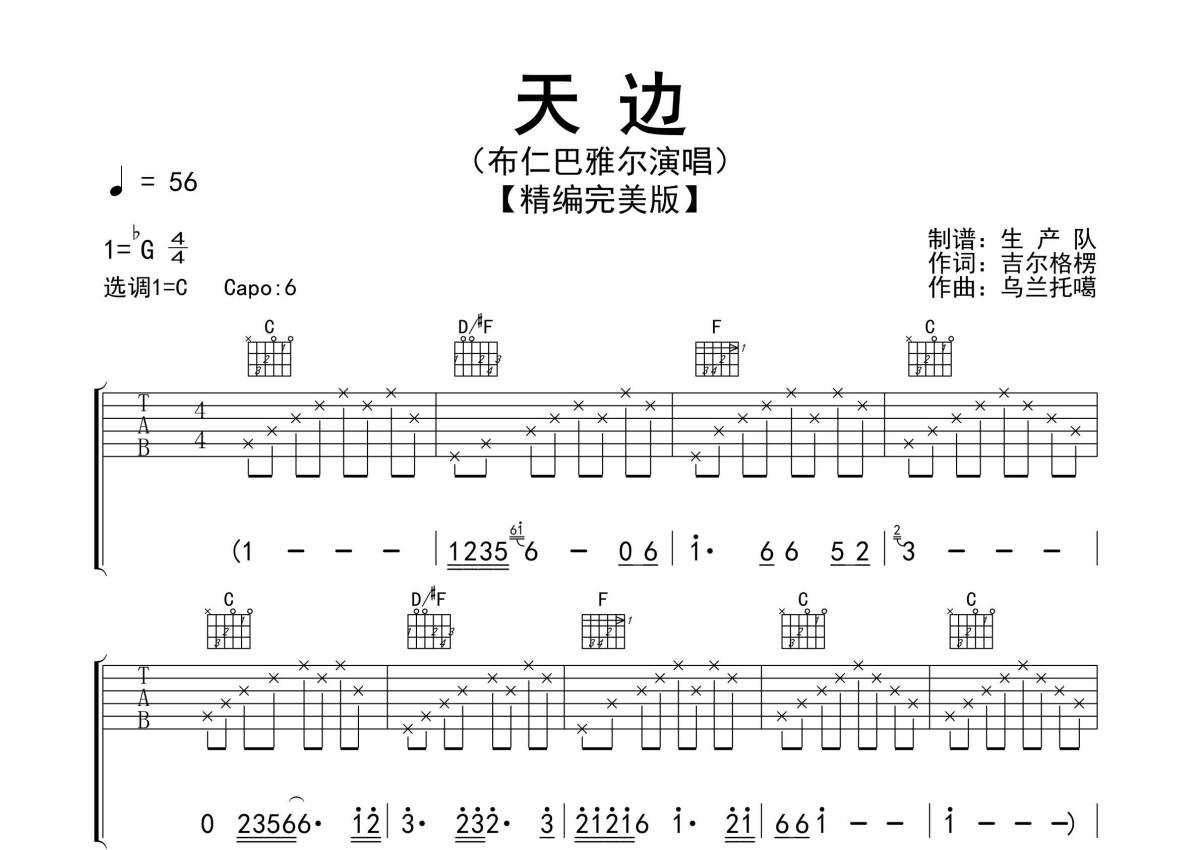 曲谱介绍: 布仁巴雅尔《天边》吉他弹唱谱,采用C调指法编配精编完美版,生产队编配出品,共有3张高清图谱。