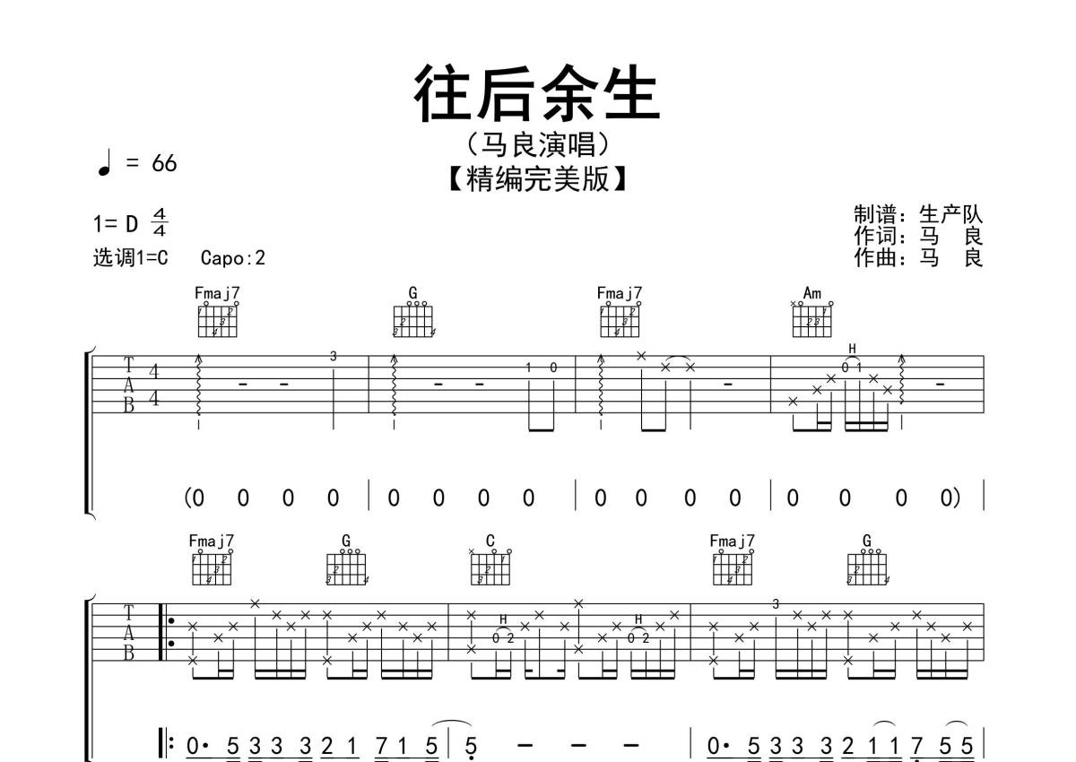 曲谱介绍: 马良《往后余生》吉他弹唱谱,采用C调指法编配精编民谣版,生产队编配出品,共有3张高清图谱。