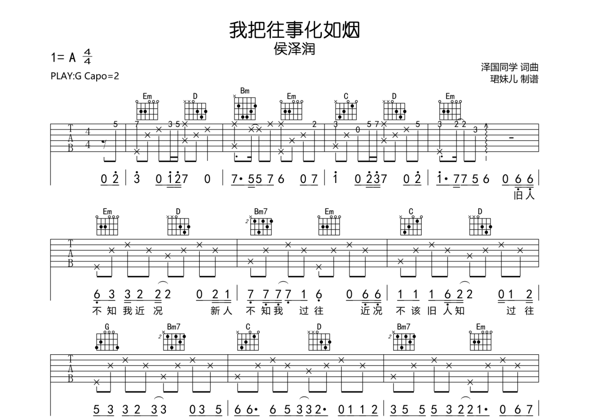 • 我把往事化如烟吉他谱 - 侯泽润 - G调吉他弹唱谱第1张