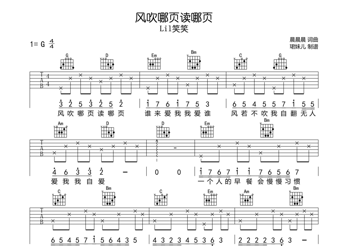 曲谱介绍: Lil笑笑《风吹哪页读哪页》吉他弹唱谱,采用C调指法编配,珺妹儿编配出品,共有2张高清图谱,免翻页排版设计。