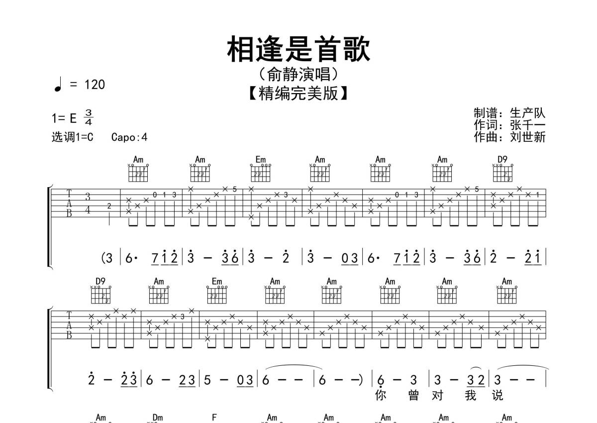 曲谱介绍: 俞静《相逢是首歌》吉他弹唱谱,采用C调指法编配精编完美版,生产队编配出品,共有3张高清图谱。