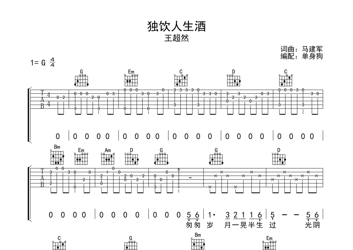 曲谱介绍: 王超然《独饮人生酒》吉他弹唱谱,采用G调指法编配,单身狗编配出品,共有3张高清图谱。