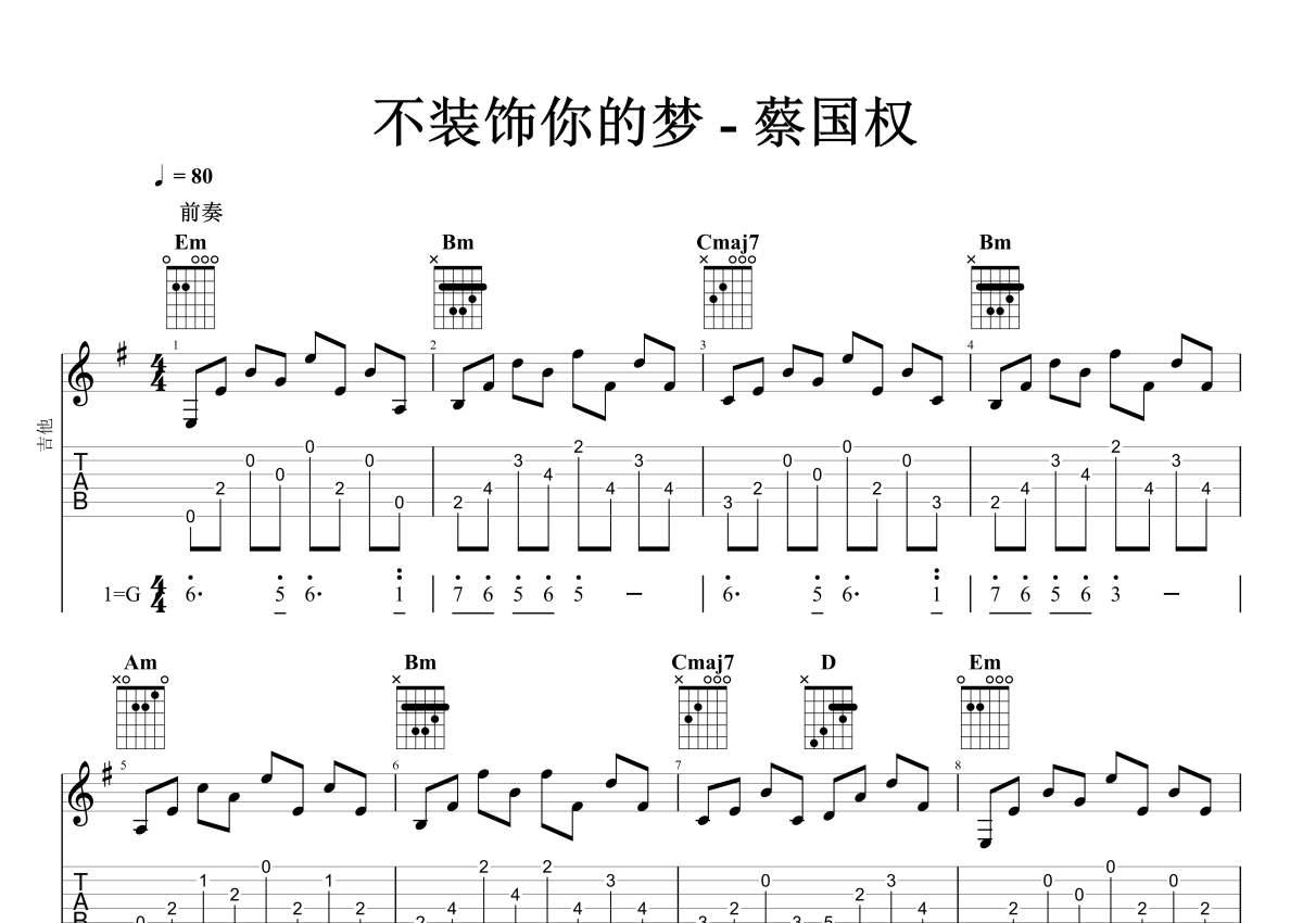 • 不装饰你的梦吉他谱 - 蔡国权 - G调吉他弹唱谱 - 石头音乐原版记谱第1张