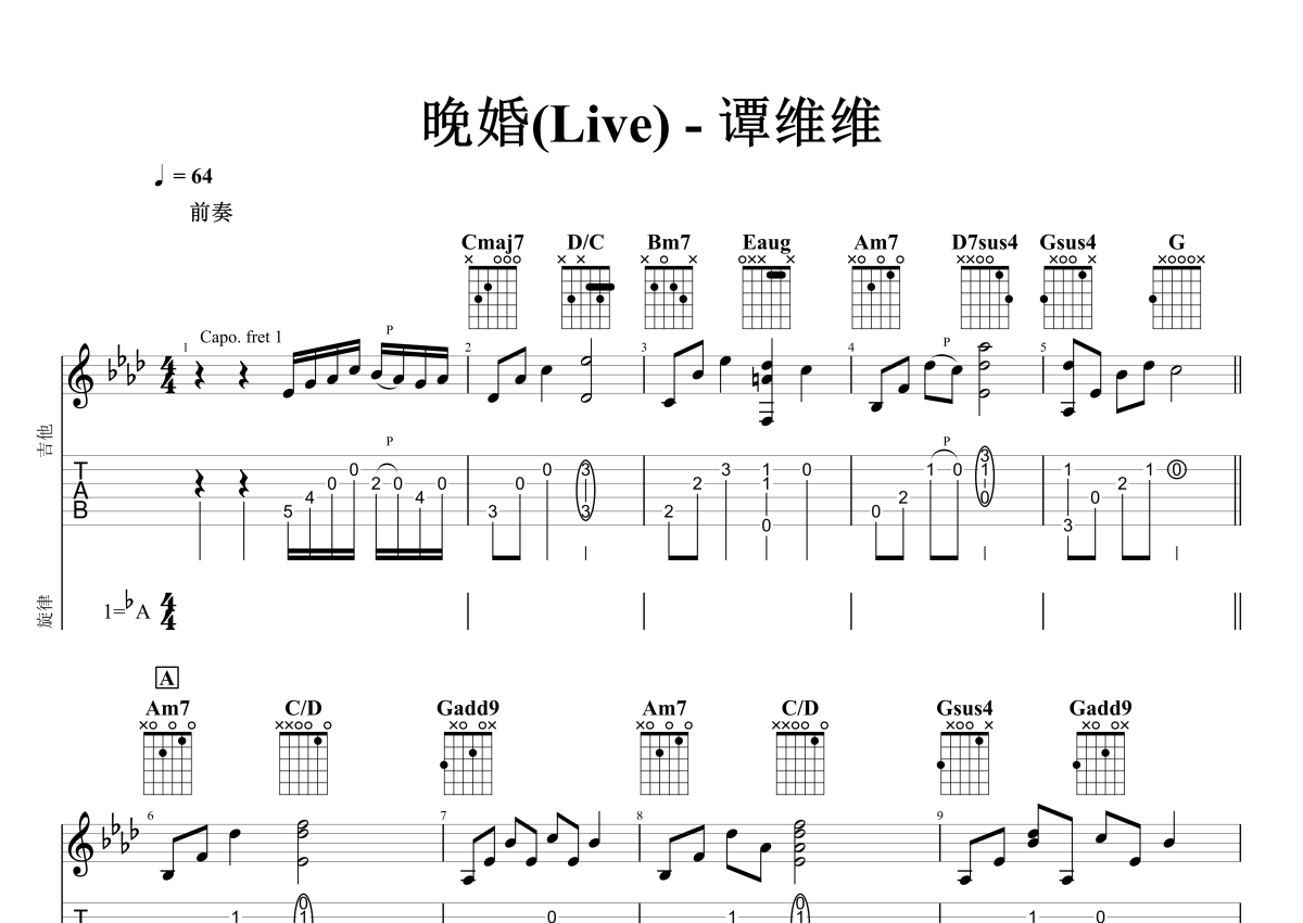曲谱介绍: 谭维维《晚婚(Live)》吉他弹唱谱,采用G调指法编配石头音乐原版记谱,石头音乐编配出品,共有7张高清图谱。