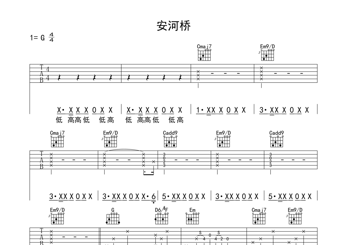 曲谱介绍: 宋冬野《安和桥》吉他弹唱谱,采用G调指法编配,石头音乐编配出品,共有4张高清图谱。