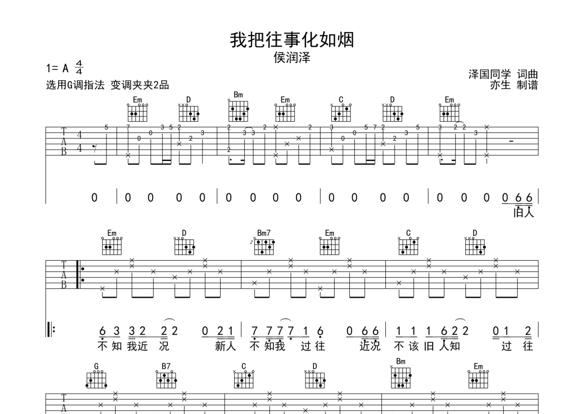 曲谱介绍: 侯润泽《我把往事化如烟》吉他弹唱谱,采用G调指法编配,亦生编配出品,共有2张高清图谱,免翻页排版设计。