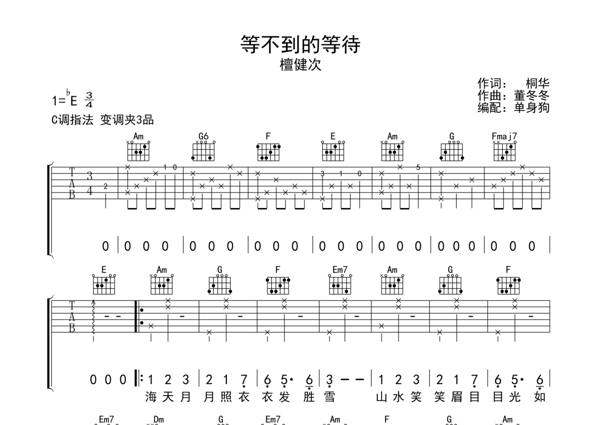 曲谱介绍: 檀健次《等不到的等待》吉他弹唱谱,采用C调指法编配,单身狗编配出品,共有3张高清图谱。