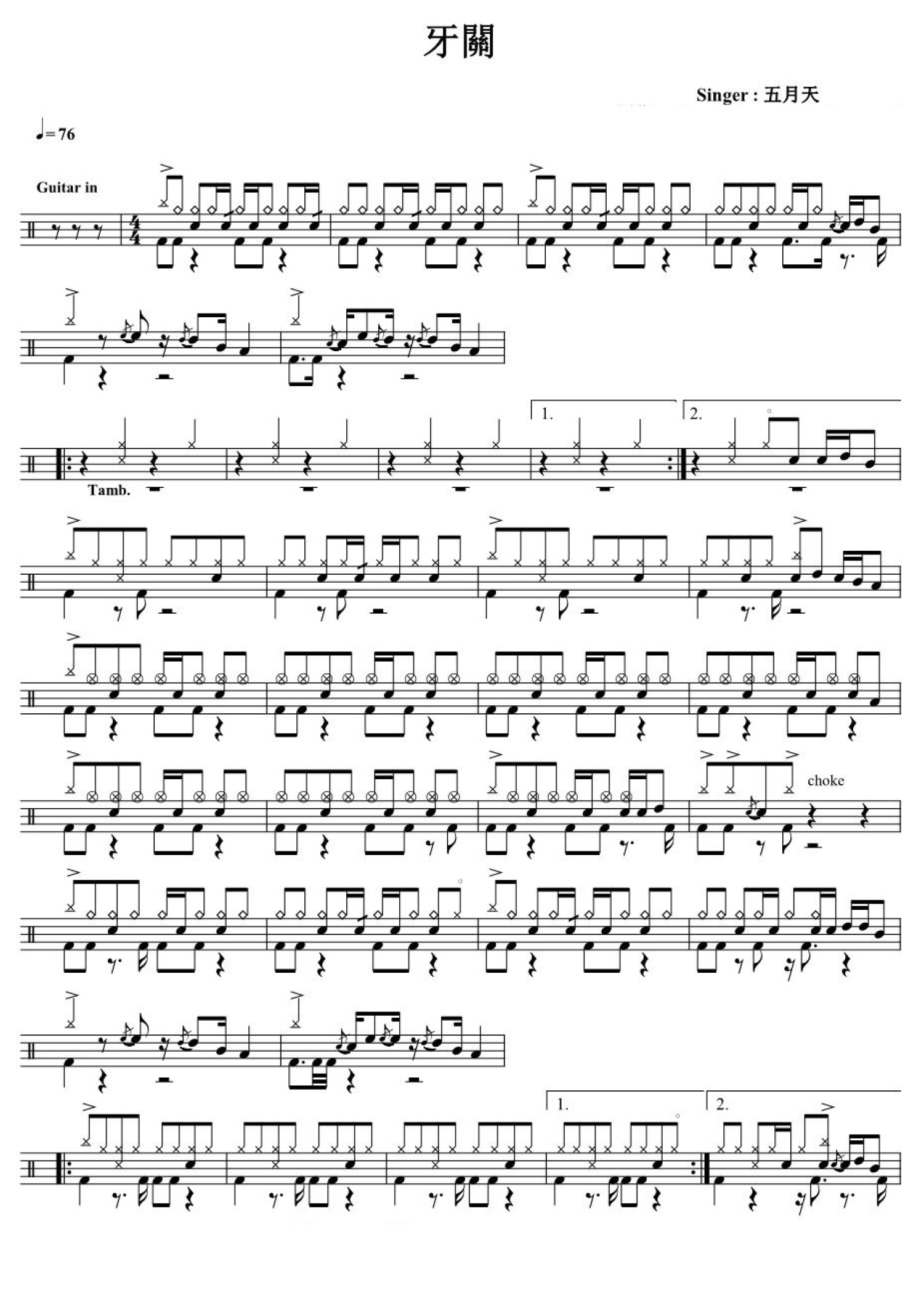 曲谱介绍: 牙关(架子鼓谱)-五月天
