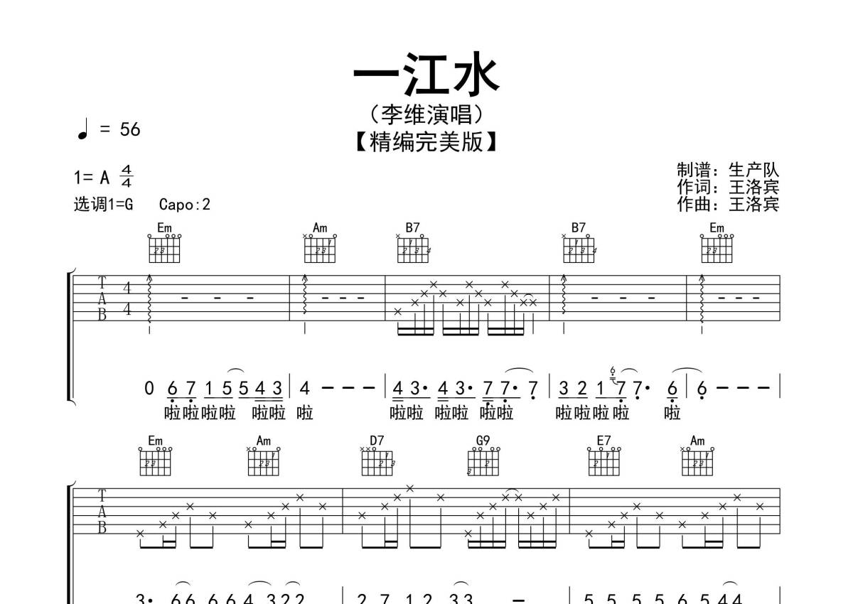 曲谱介绍: 李维《一江水》吉他弹唱谱,采用G调指法编配精编完美版,生产队编配出品,共有1张高清图谱,免翻页排版设计。