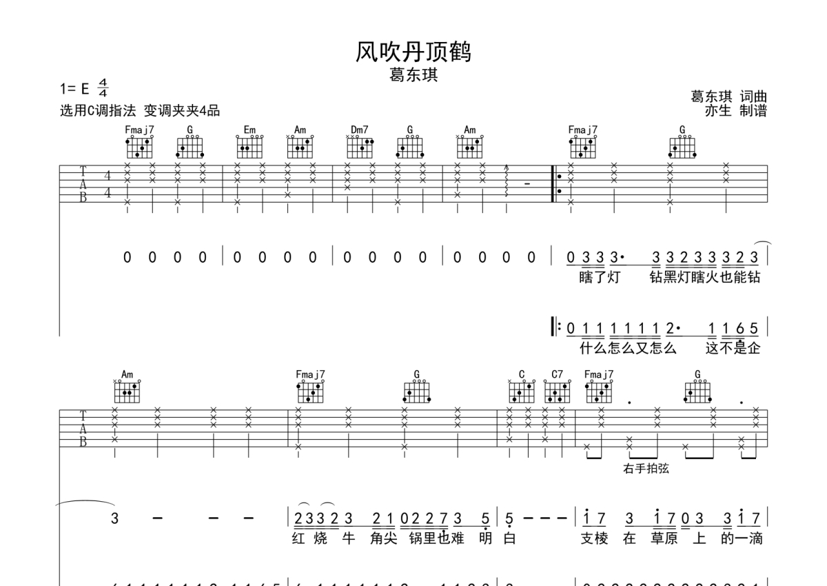 曲谱介绍: 葛东琪《风吹丹顶鹤》吉他弹唱谱,采用C调指法编配,亦生编配出品,共有2张高清图谱,免翻页排版设计。