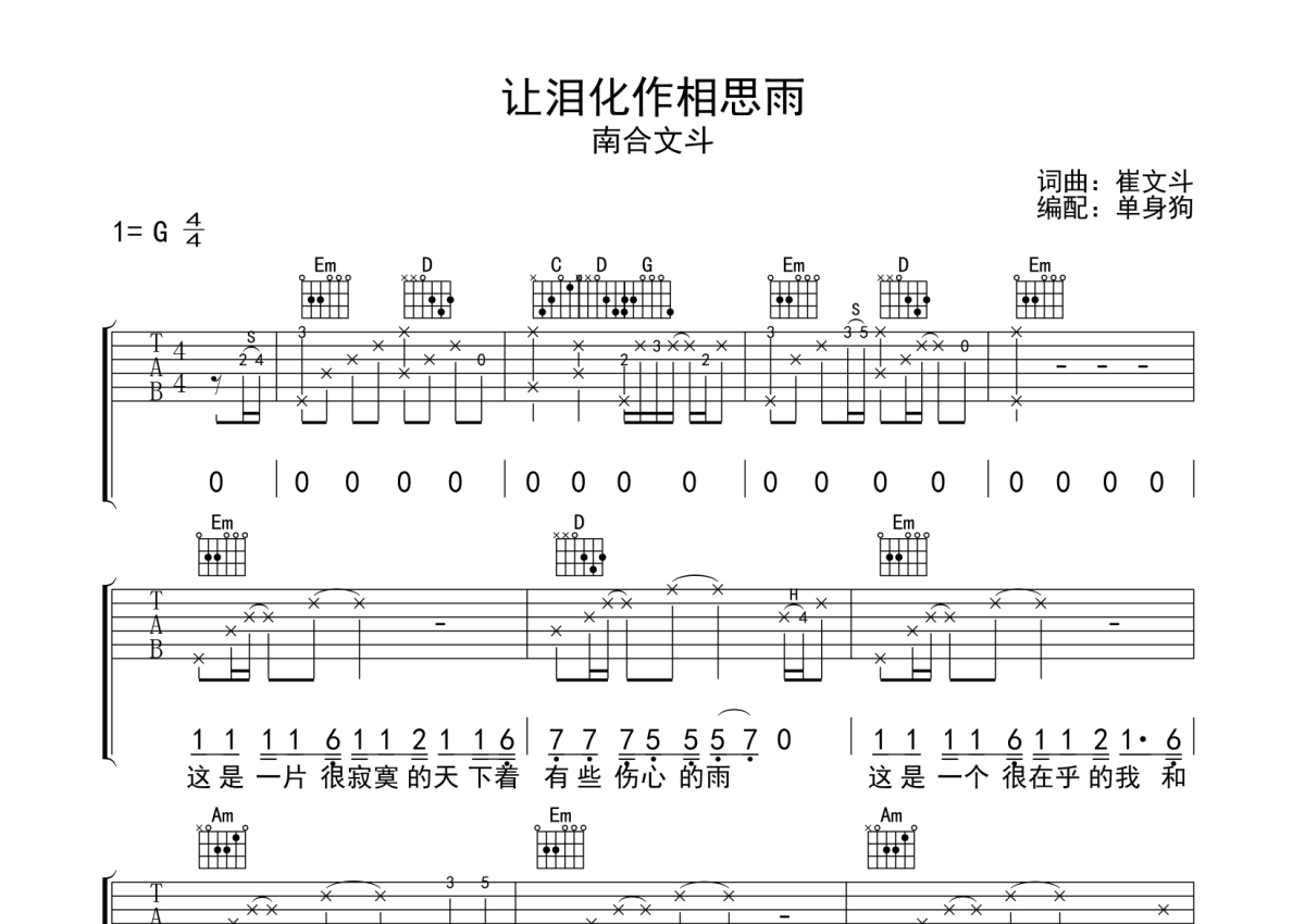 曲谱介绍: 南合文斗《让泪化作相思雨》吉他弹唱谱,采用G调指法编配,单身狗编配出品,共有3张高清图谱。