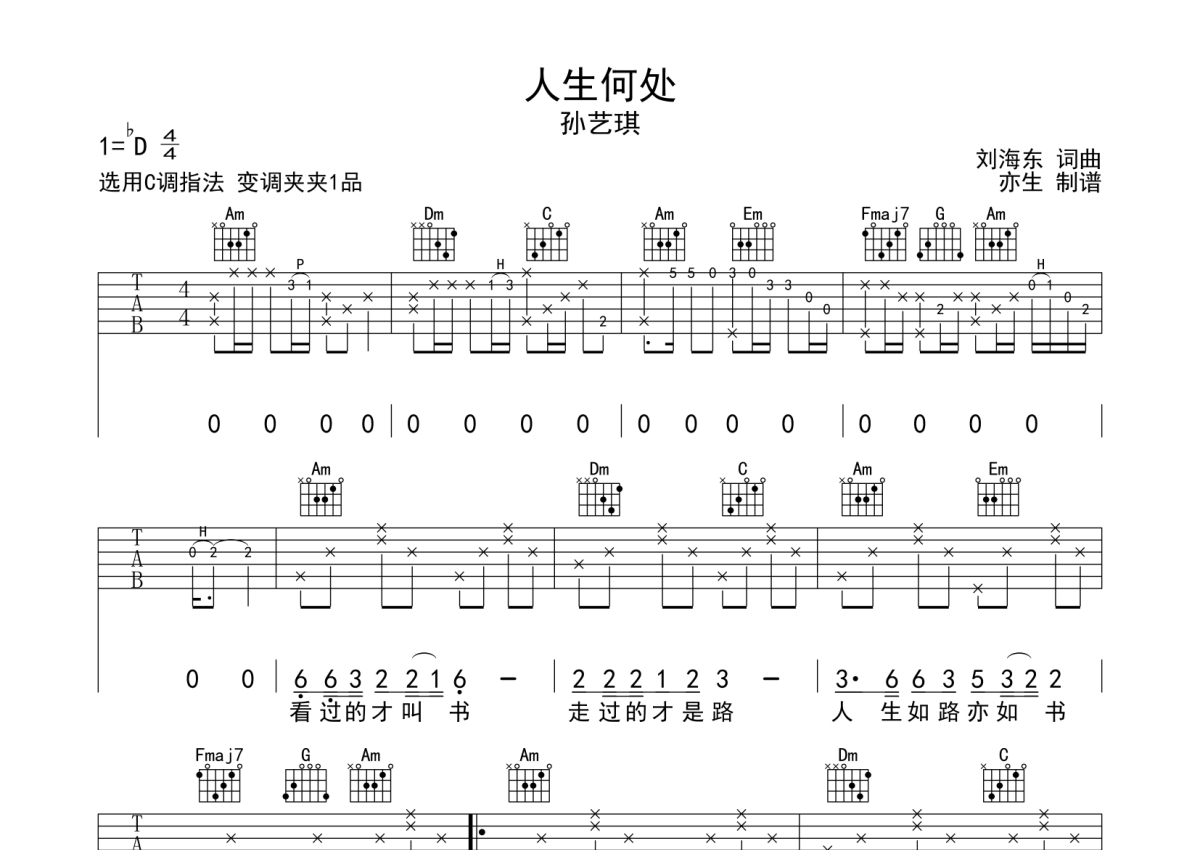 • 人生何处吉他谱 - 孙艺琪 - C调吉他弹唱谱第1张