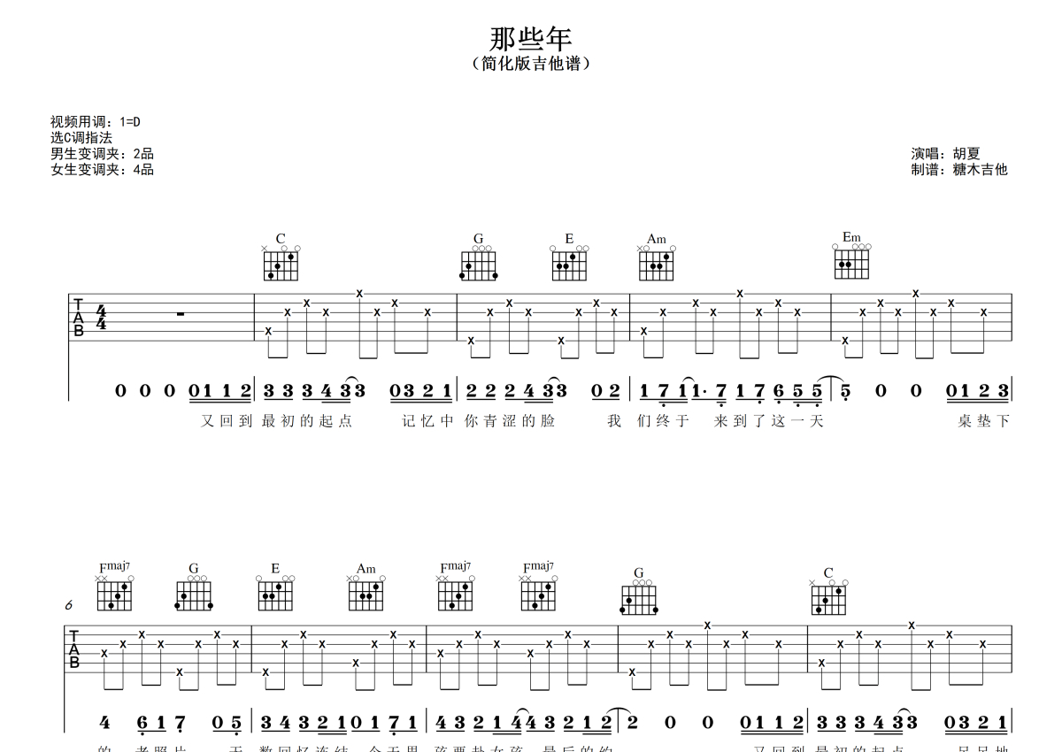 曲谱介绍: 胡夏《那些年》吉他弹唱谱,采用C调指法编配,糖木吉他编配出品,共有4张高清图谱。
