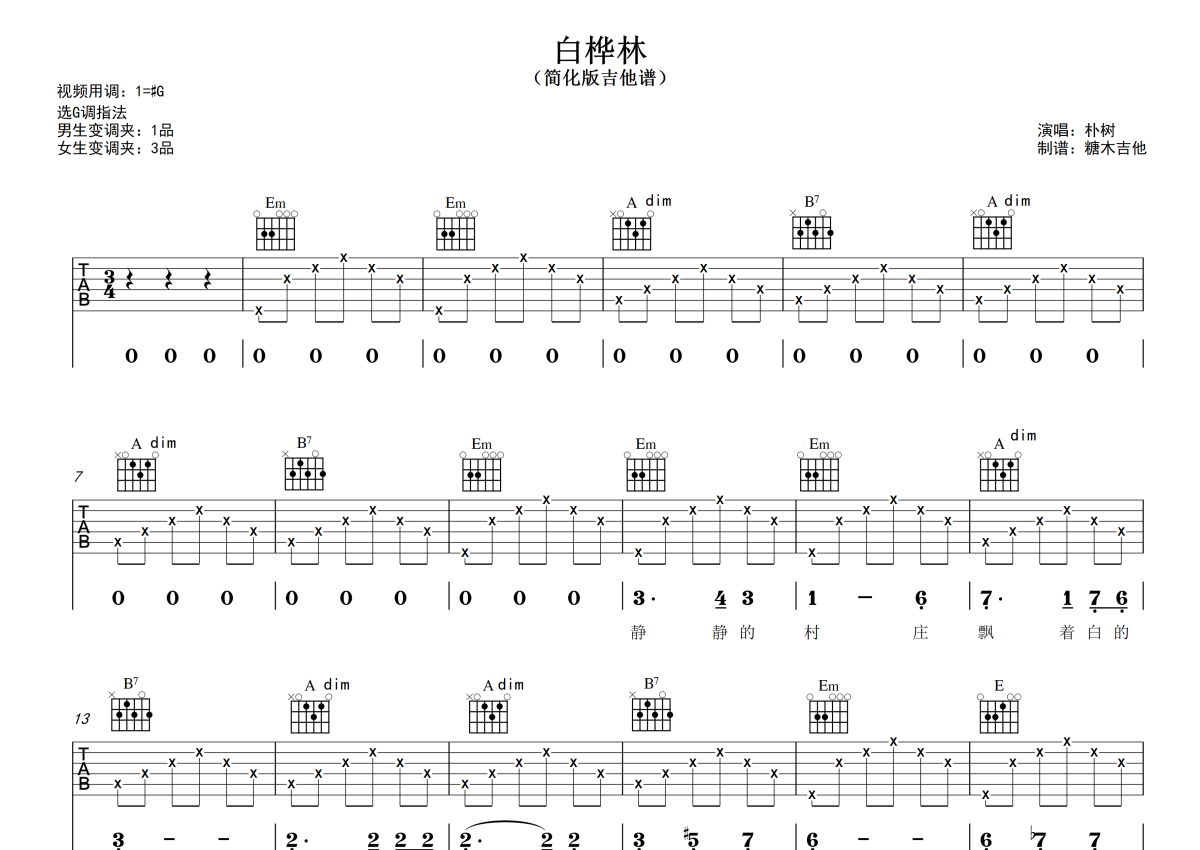 曲谱介绍: 朴树《白桦林》吉他弹唱谱,采用G调指法编配,糖木吉他编配出品,共有4张高清图谱。