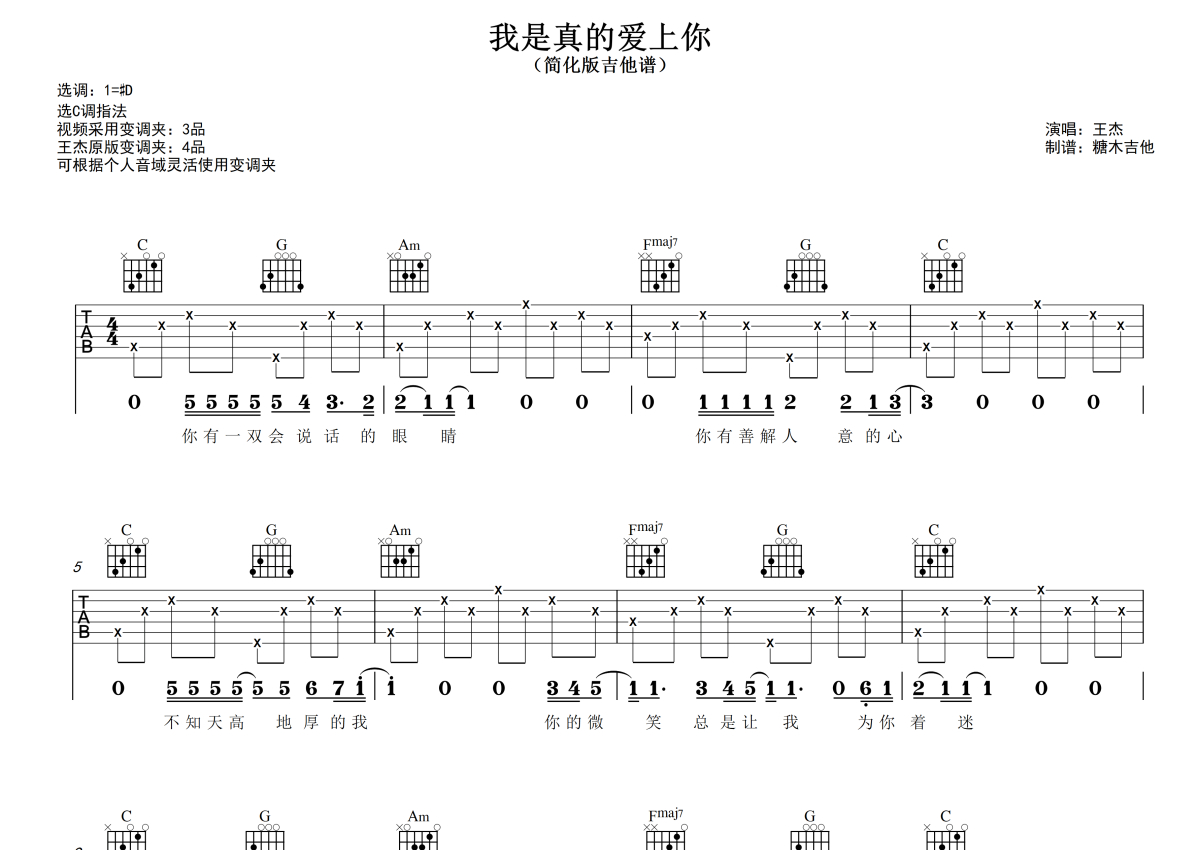 曲谱介绍: 王杰《我是真的爱上你》吉他弹唱谱,采用C调指法编配,糖木吉他编配出品,共有3张高清图谱。