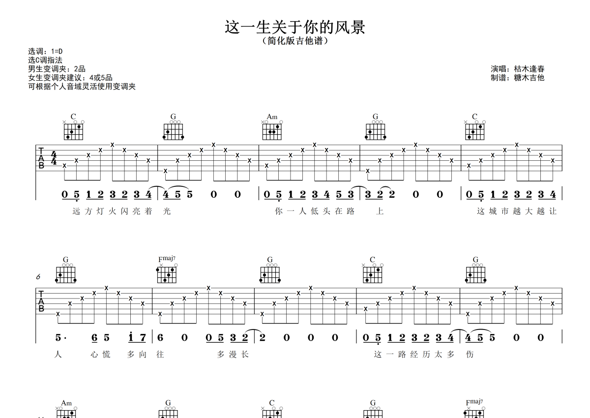 曲谱介绍: 枯木逢春《这一生关于你的风景》吉他弹唱谱,采用C调指法编配,糖木吉他编配出品,共有3张高清图谱。