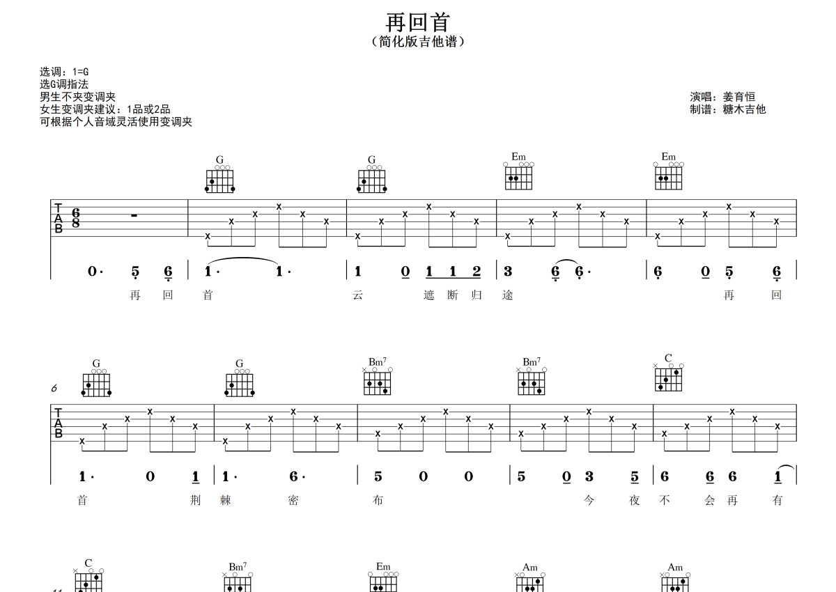 曲谱介绍: 姜育恒《再回首》吉他弹唱谱,采用G调指法编配,糖木吉他编配出品,共有4张高清图谱。