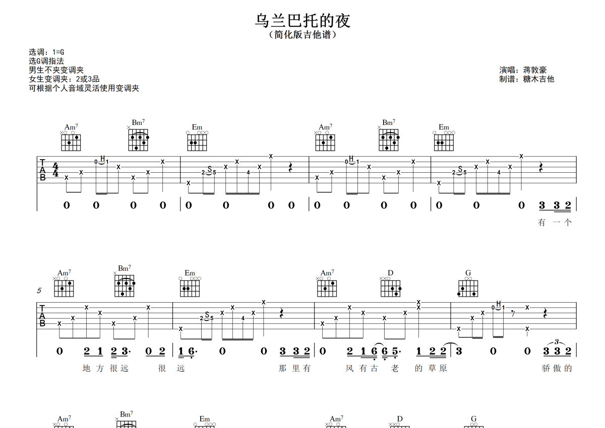 曲谱介绍: 蒋敦豪《乌兰巴托的夜》吉他弹唱谱,采用G调指法编配,糖木吉他编配出品,共有3张高清图谱。