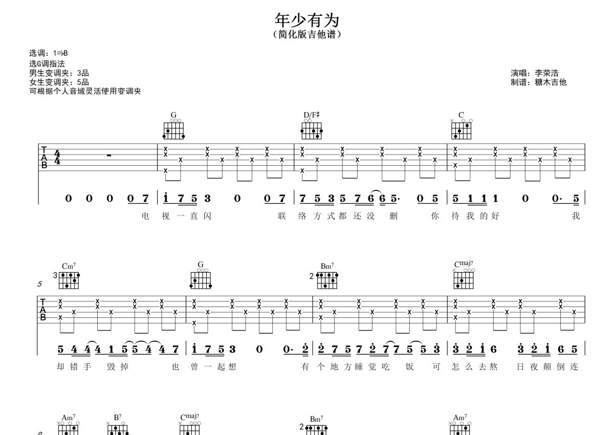 曲谱介绍: 李荣浩《年少有为》吉他弹唱谱,采用G调指法编配,糖木吉他编配出品,共有3张高清图谱。