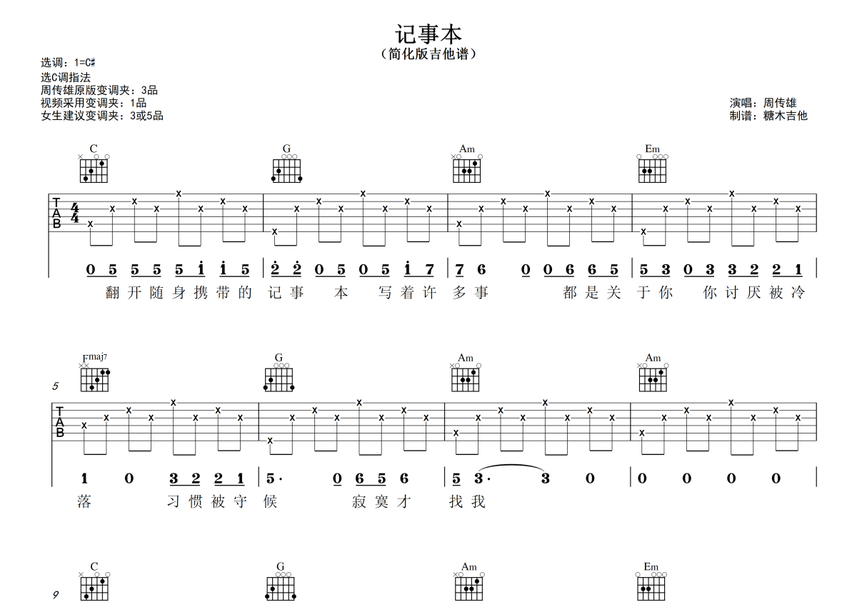 曲谱介绍: 周传雄《记事本》吉他弹唱谱,采用C调指法编配,糖木吉他编配出品,共有3张高清图谱。