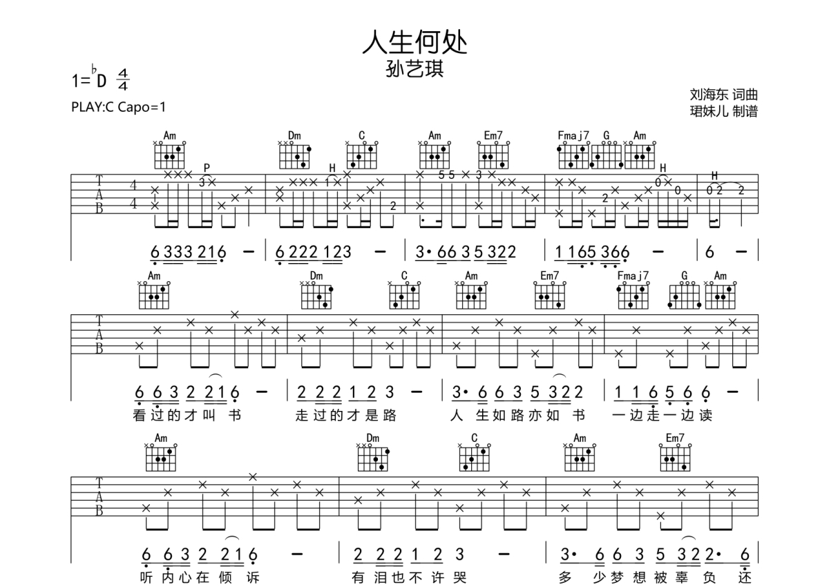 • 人生何处吉他谱 - 孙艺琪 - C调吉他弹唱谱第1张