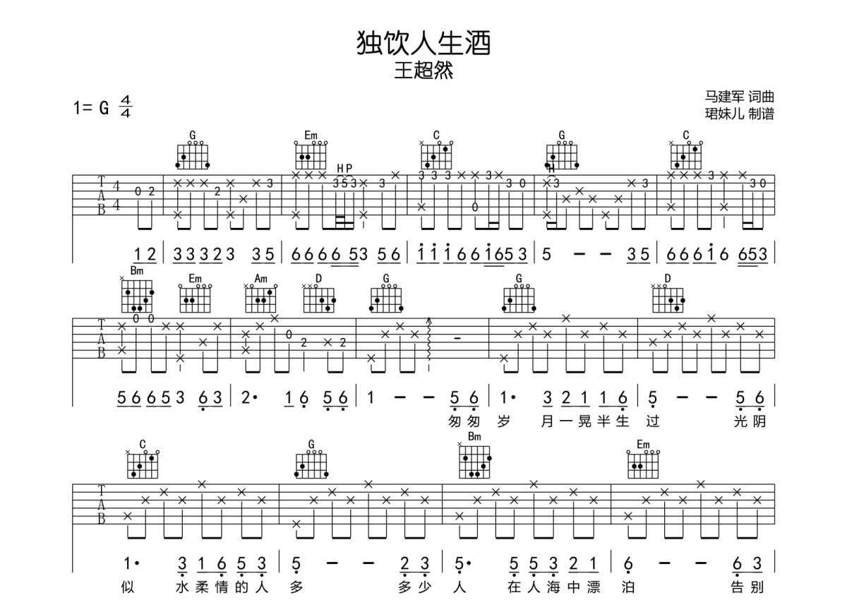 曲谱介绍: 王超然《独饮人生酒》吉他弹唱谱,采用G调指法编配,珺妹儿编配出品,共有2张高清图谱,免翻页排版设计。