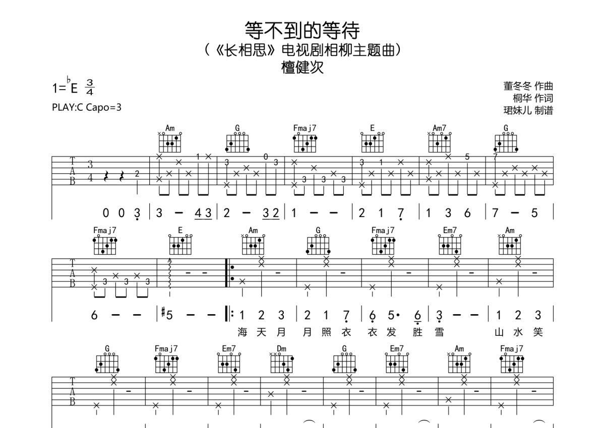 曲谱介绍: 檀健次《等不到的等待》吉他弹唱谱,采用C调指法编配,珺妹儿编配出品,共有2张高清图谱,免翻页排版设计。