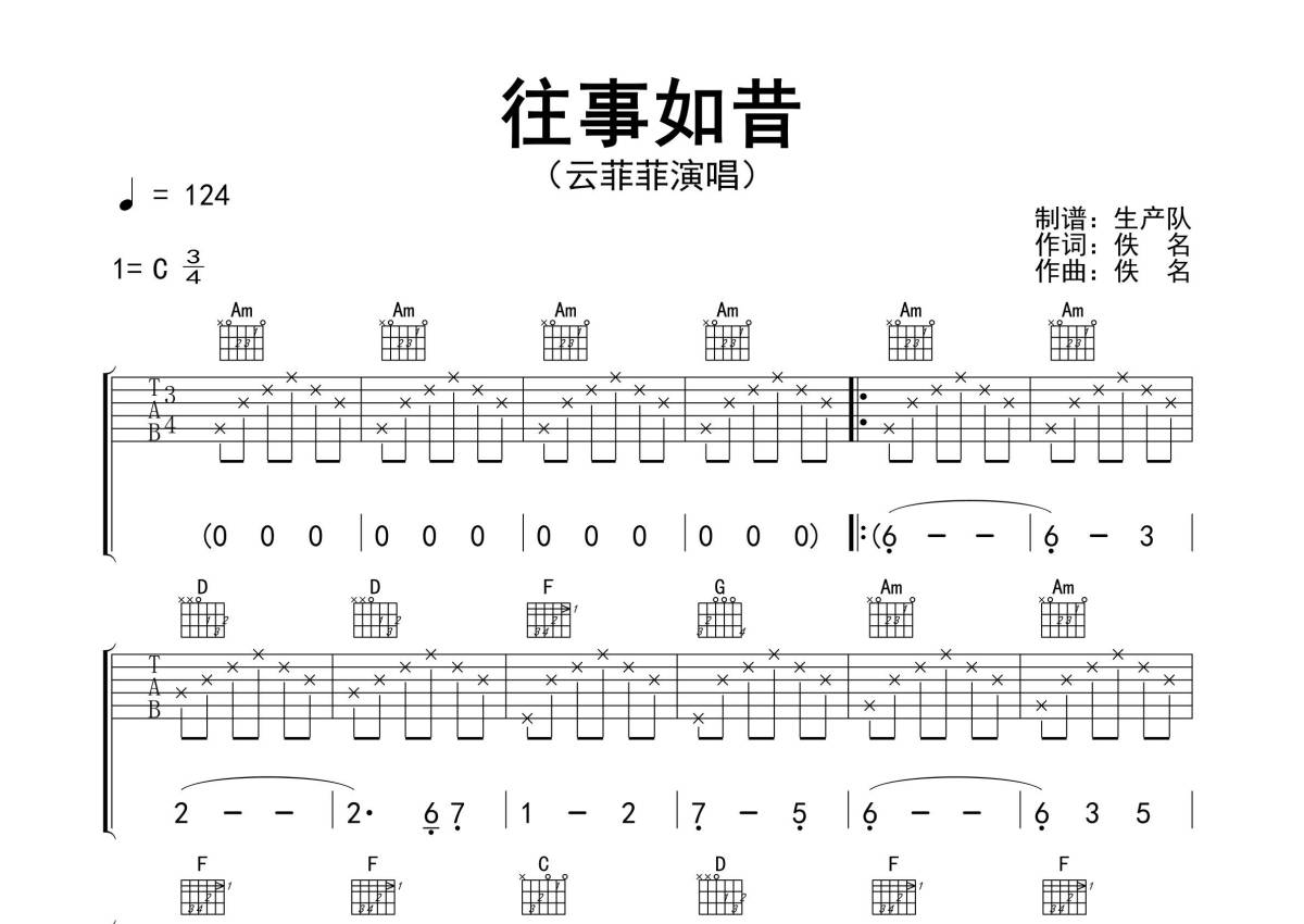 曲谱介绍: 云菲菲《往事如昔》吉他弹唱谱,采用C调指法编配精编民谣版,生产队编配出品,共有3张高清图谱。