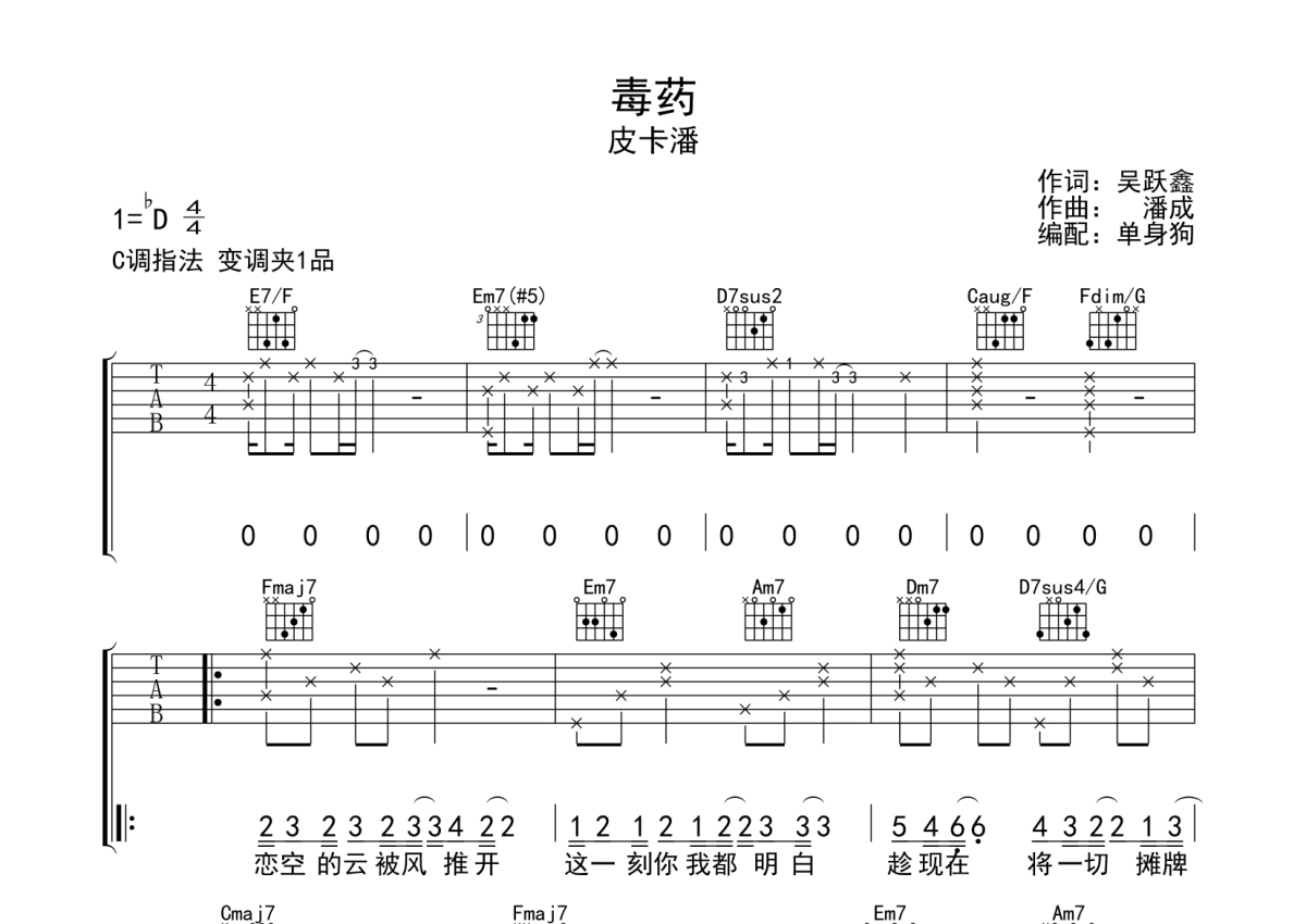 曲谱介绍: 皮卡潘《毒药》吉他弹唱谱,采用C调指法编配,单身狗编配出品,共有3张高清图谱。