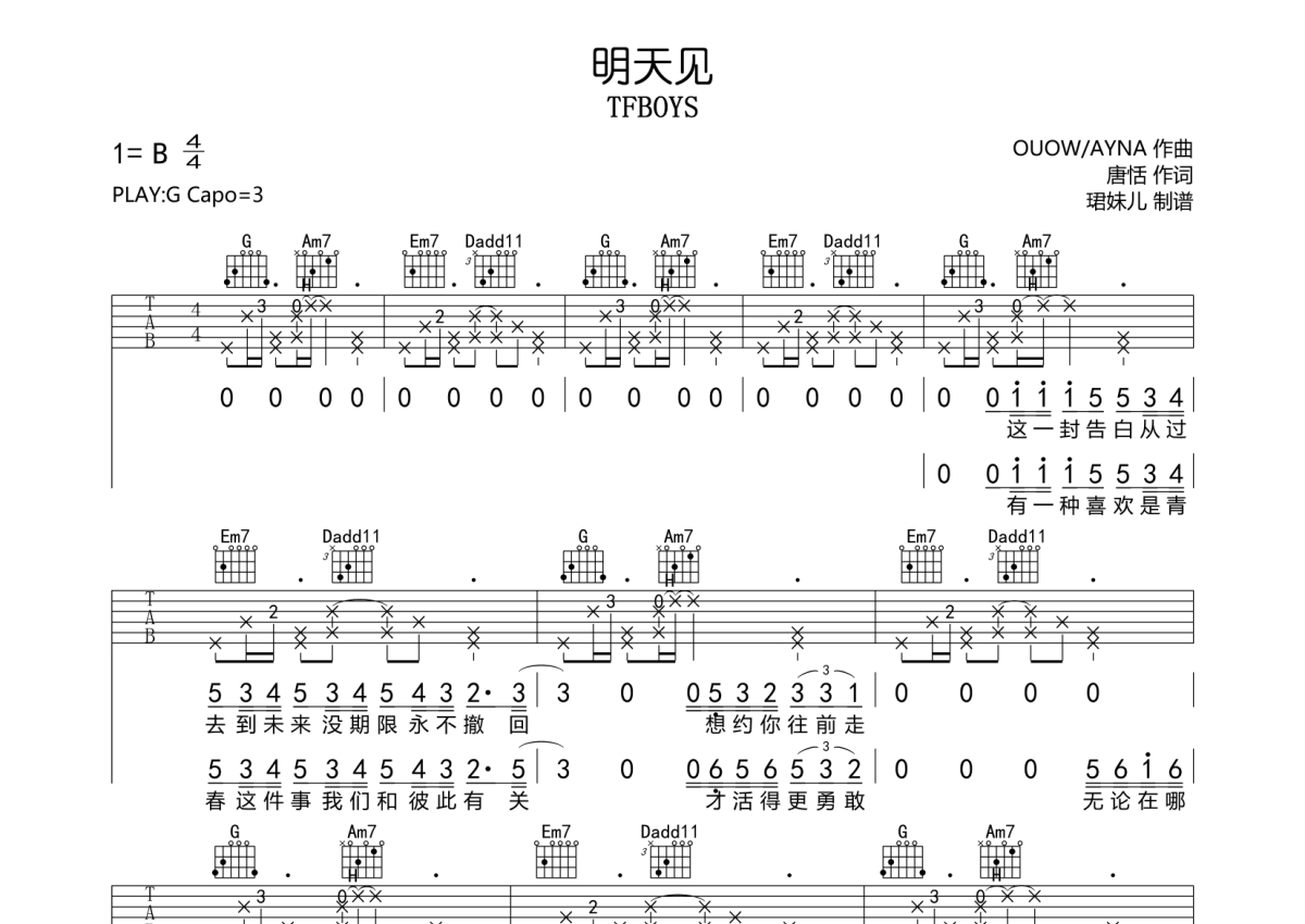 • 明天见吉他谱 - TFBOYS - G调吉他弹唱谱第1张