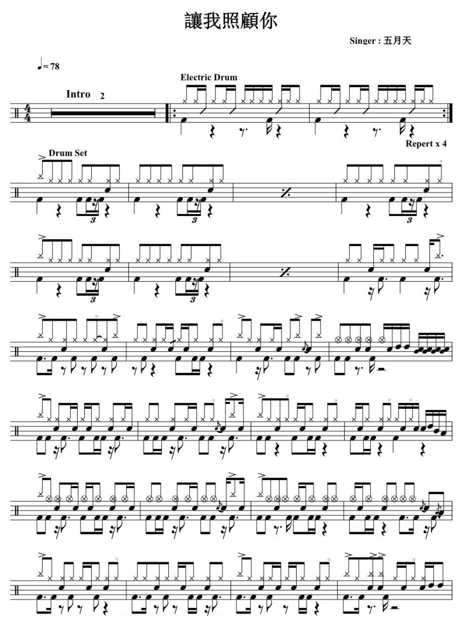 曲谱介绍: 请让我照顾你(架子鼓谱)-五月天