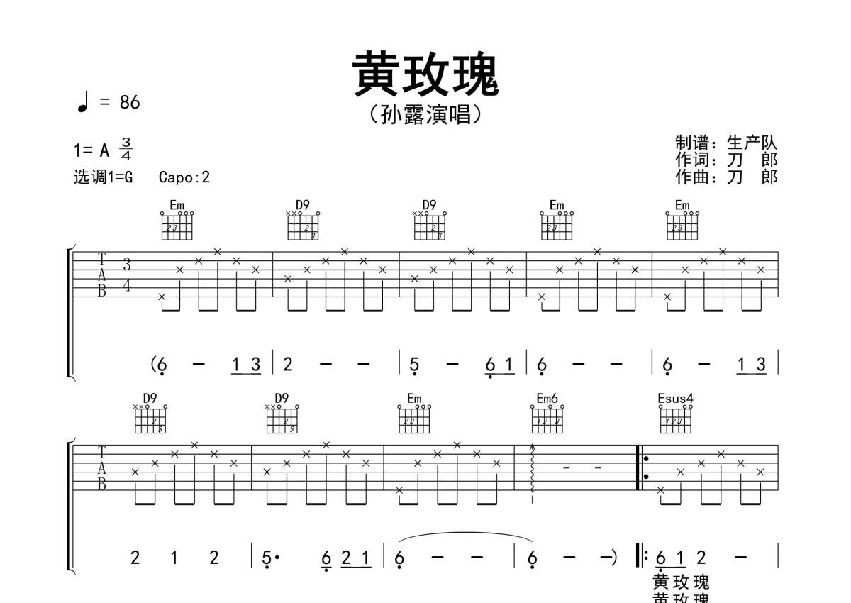曲谱介绍: 孙露《黄玫瑰》吉他弹唱谱,采用G调指法编配精编版,生产队编配出品,共有3张高清图谱。