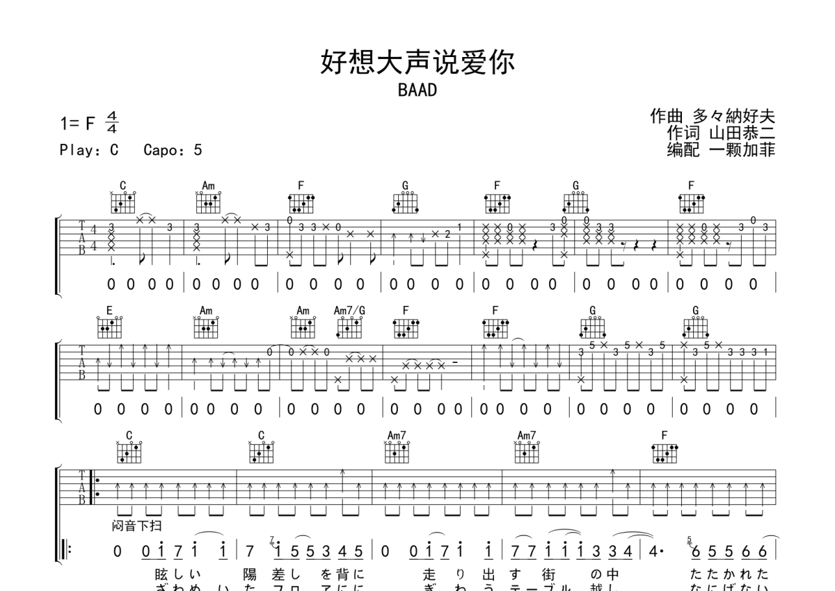 曲谱介绍: BAAD《好想大声说爱你》吉他弹唱谱,采用C调指法编配,一颗加菲编配出品,共有3张高清图谱。