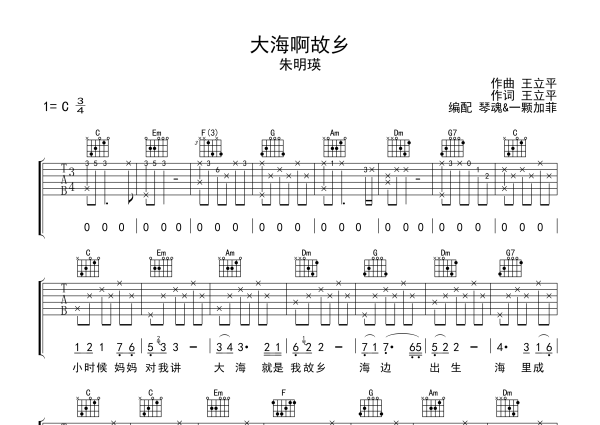 • 大海啊故乡吉他谱 - 朱明瑛 - C调吉他弹唱谱第1张